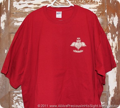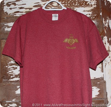 The 3 photos above showcase the Heather Red short-sleeved shirts with Scroll/Fancy Cross Design, available in adult sizes only. Features gold glitter Boss Your Heart logo on front (in memory of Chrissie). The back boasts a large scroll/fancy cross in jewel tones of purple, teal green, red, and gold glitter. Beautiful shirts!