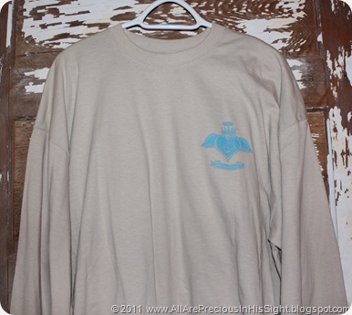 The 3 photos above showcase the sand/tan long-sleeved shirts with splatter/simple cross design, available in adult and youth sizes. Features blue Boss Your Heart logo on front (in memory of Chrissie). The back boasts a large splatter/simple cross with olive green, blue, tan, and chocolate brown. Rockin’ shirts!