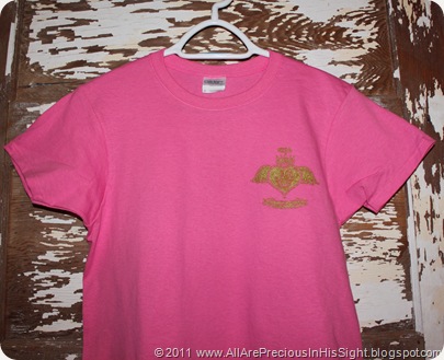 The 3 photos above showcase the pink slim fit short-sleeved shirts with scroll/fancy cross design, available in adult sizes only (order 1-2 sizes larger for a looser fit). Features gold glitter Boss Your Heart logo on front (in memory of Chrissie). The back boasts a large scroll/fancy cross with teal/jade, purple, and gold glitter. Pretty shirts!