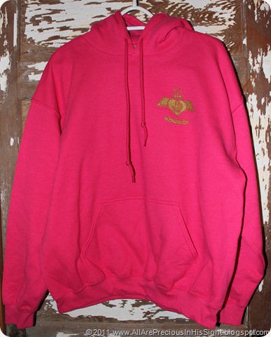 The 3 photos above showcase the hot pink sweatshirts with scroll/fancy cross design, available in adult and youth sizes. Features gold glitter Boss Your Heart logo on front (in memory of Chrissie). The back boasts a large scroll/fancy cross with purple, teal/jade, hot pink, and gold glitter. Lovely sweatshirts!