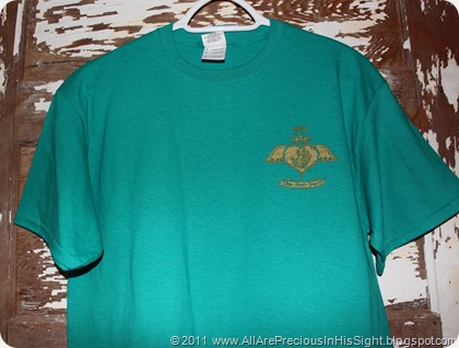 The 3 photos above showcase the teal/jade short-sleeved shirts with scroll/fancy cross design, available in adult and youth sizes. Features gold glitter Boss Your Heart logo on front (in memory of Chrissie). The back boasts a large scroll/fancy cross with two shades of teal/jade, purple, and gold glitter. Striking shirts!